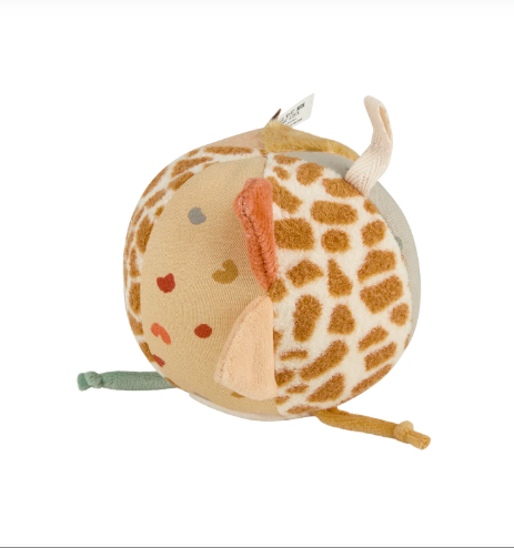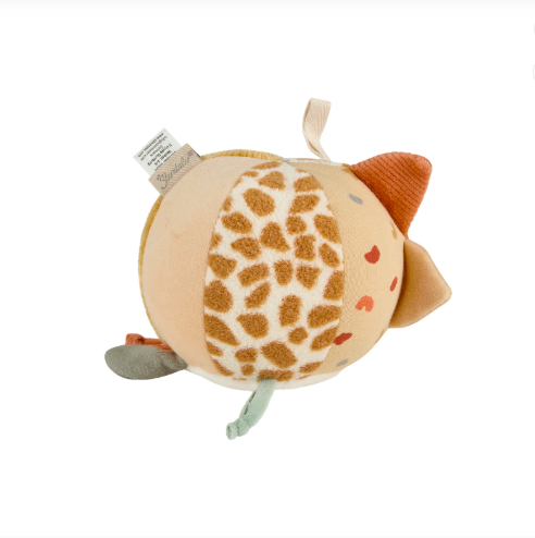 Υφασμάτινη μπάλα δραστηριοτήτων με μοτίβα safari και χαριτωμένες υφές που τραβούν την προσοχή του μωρού.