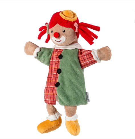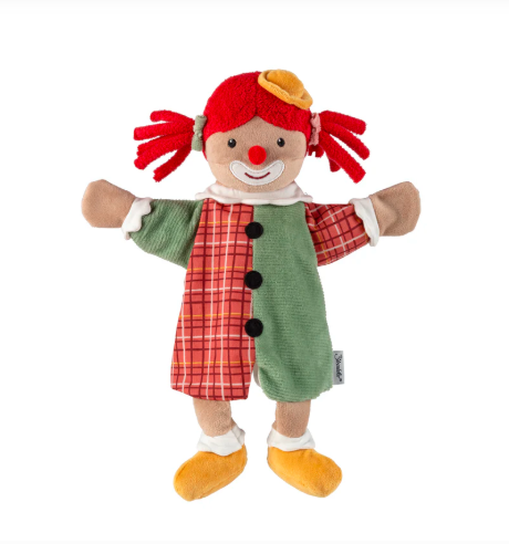 Χαρούμενη υφασμάτινη κούκλα κουκλοθεάτρου σε σχέδιο κλόουν που χαρίζει ατελείωτες στιγμές διασκέδασης.