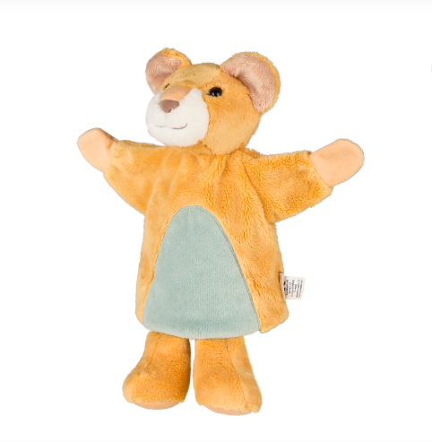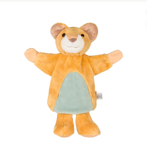 Απαλή υφασμάτινη κούκλα κουκλοθεάτρου σε σχέδιο χαριτωμένου λιονταριού που κάνει το παιχνίδι πιο ζωντανό.