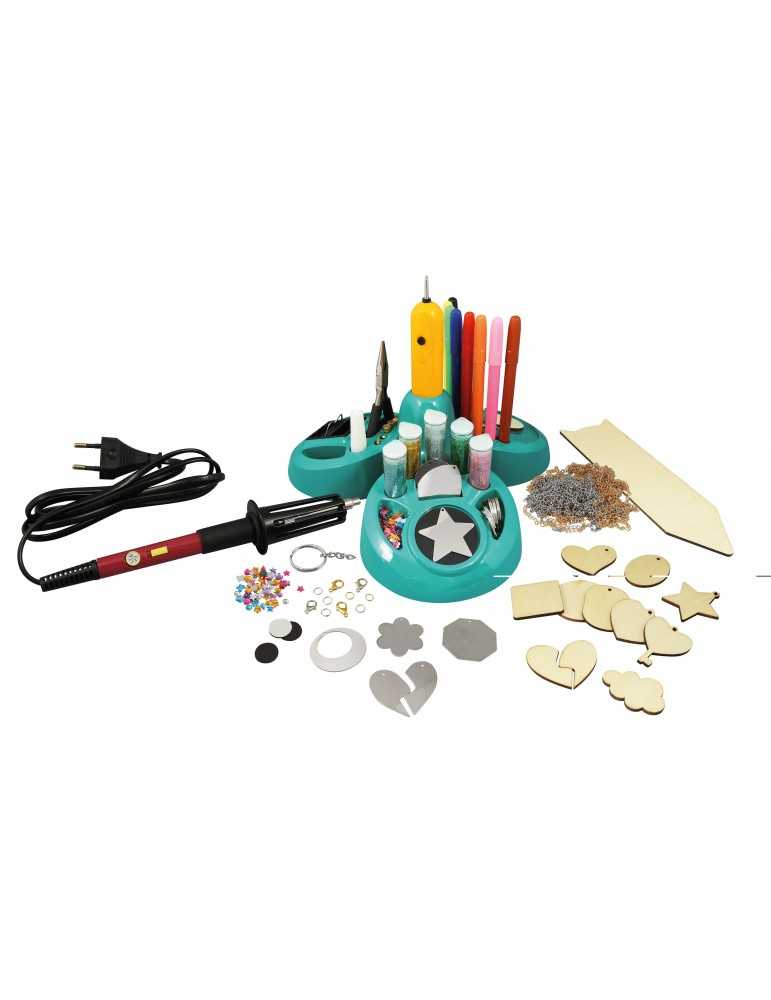 Ο μεταλλικός χαράκτης μπορεί να χρησιμοποιηθεί για να σχεδιάσει σχέδια σε μεταλλικές πλάκες που μπορούν στη συνέχεια να γίνουν κοσμήματα ή μπρελόκ! Περιλαμβάνονται πολλά αξεσουάρ για τη δημιουργία και διακόσμηση: μύτες από τσόχα, διαμάντι, κόλλα, τσιμπιδάκι, σχήματα μετάλλου και ξύλου, αλυσίδες, δαχτυλίδια, κουμπώματα κλπ. Το εργαλείο καύσης ξύλου λειτουργεί με ρεύμα, και ο μεταλλικός χαράκτης απαιτεί μπαταρίες, δεν περιλαμβάνονται. Φύλλο οδηγιών με έγχρωμες εικόνες