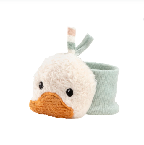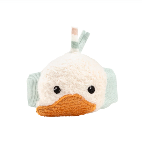 Υφασμάτινη κουδουνίστρα καρπού σε σχέδιο χαριτωμένου παπιού Edda που διασκεδάζει και απασχολεί το μωρό.
