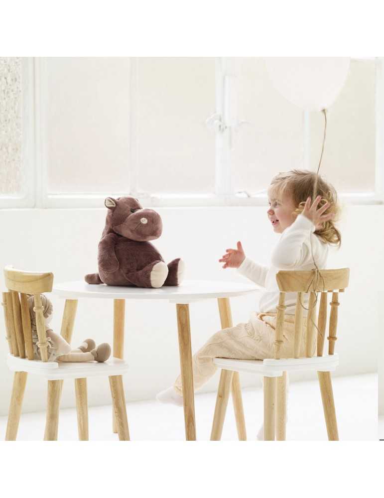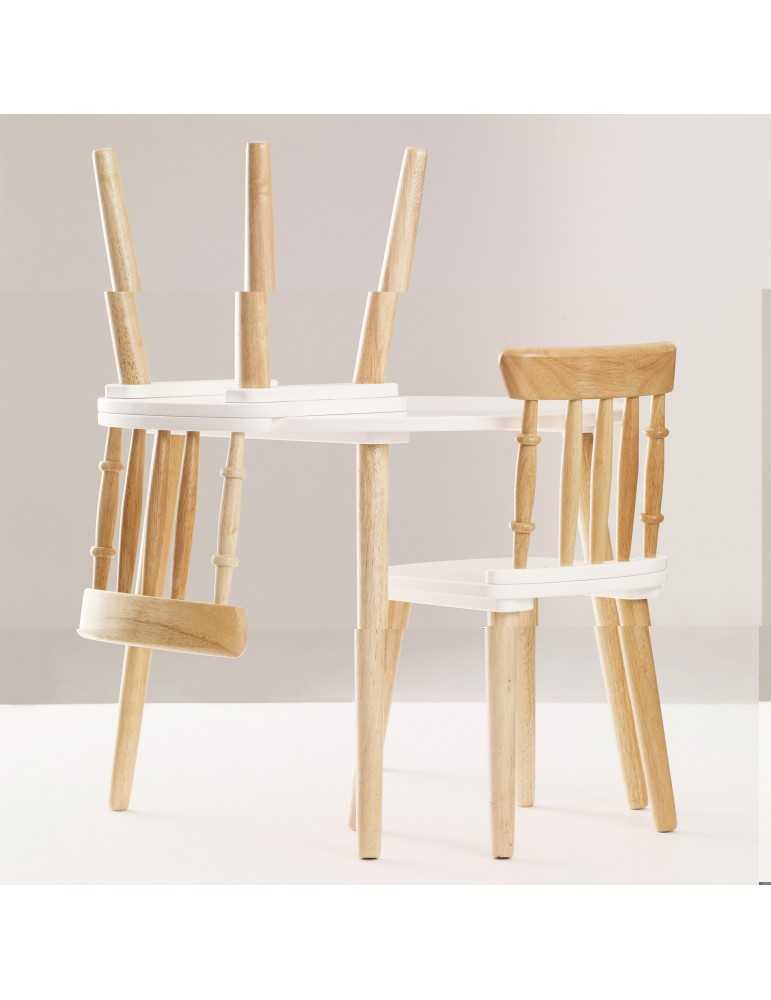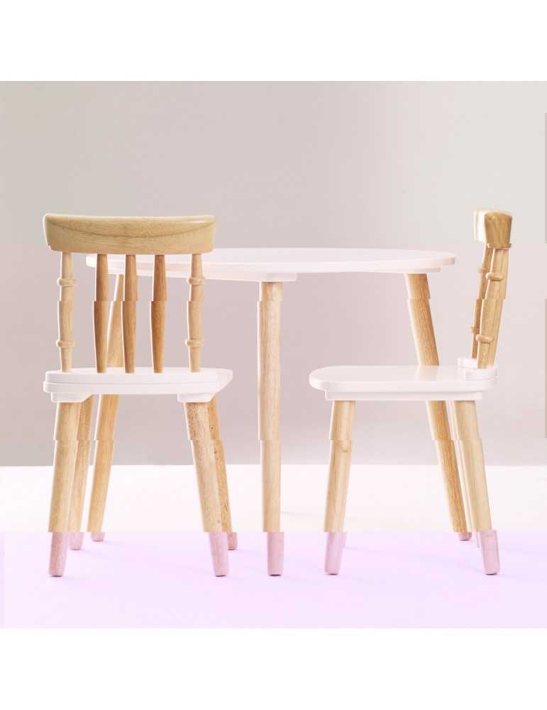 Τραπέζι με λευκή στρογγυλή (χωρις γωνίες) επιφάνεια και δύο καρέκλες με εξαιρετικό vintage σχεδιασμό. Κατασκευασμένο από ξύλο FSC και βαμμένα με υψηλής ποιότητας υδατοχρώματα. Ιδανικό για κάθε χώρο!