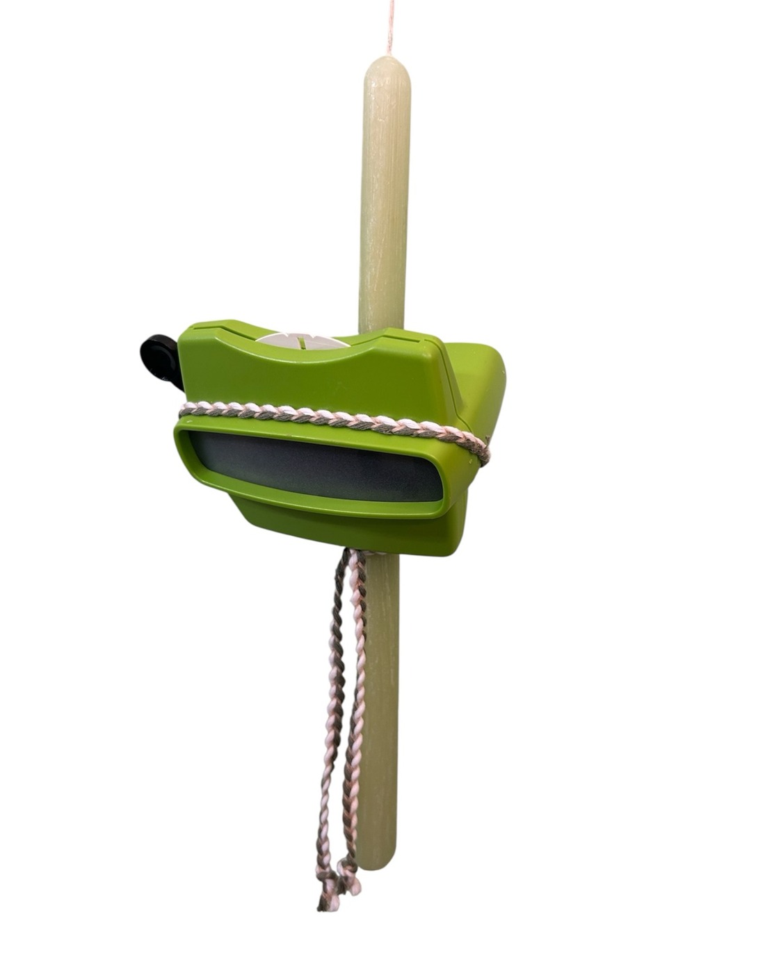 Η πράσινη λαμπάδα δένει αρμονικά με το αντίστοιχο πράσινο viewer, δημιουργώντας ένα θεματικό και καλαίσθητο αποτέλεσμα που ξεχωρίζει. Η διακόσμηση ολοκληρώνεται με δίχρωμο πλεκτό κορδόνι, προσθέτοντας λεπτομέρεια και ισορροπία στο συνολικό design.